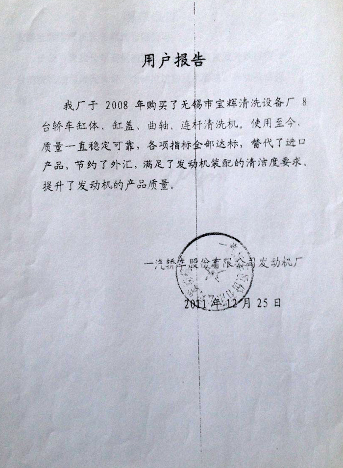 一汽轎車股份有限公司發(fā)動(dòng)機(jī)廠用戶報(bào)告