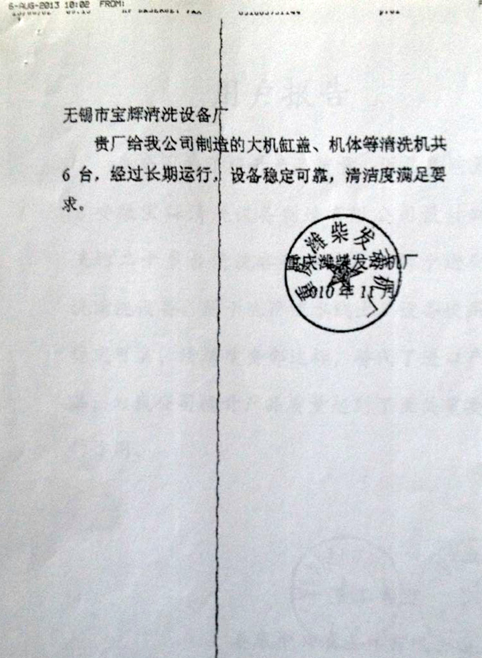 關(guān)鍵詞:重慶濰柴發(fā)動(dòng)機(jī)廠用戶報(bào)告  發(fā)布日期:2015-03-05  來源:安徽寶輝清洗設(shè)備制造有限公司